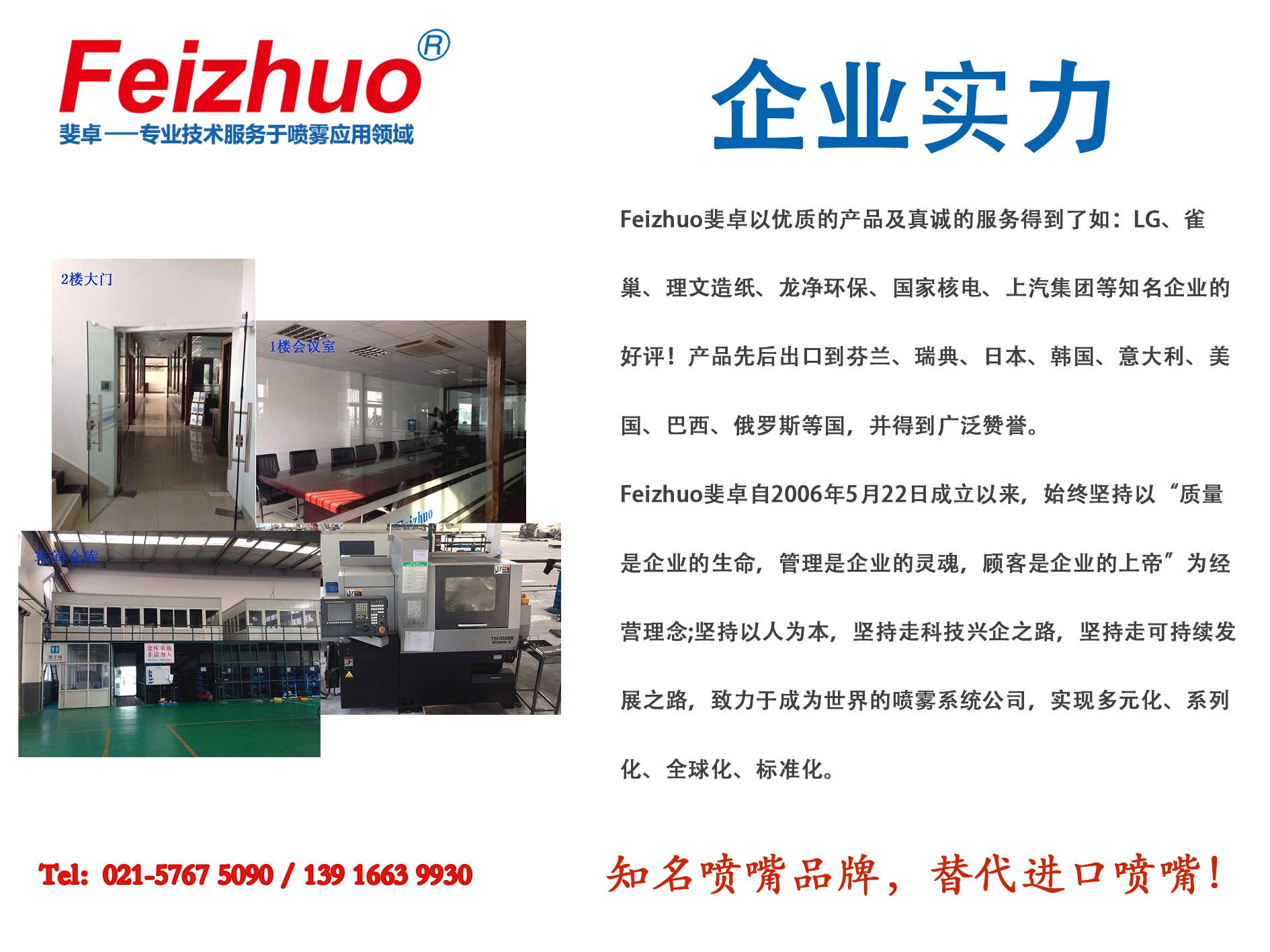 噴嘴廠家,F(xiàn)eizhuo斐卓公司,是一家致力于噴霧控制和環(huán)境科技的綜合型大型噴嘴加工廠!公司有自己的研發(fā)中心,銷售團(tuán)隊,售后服務(wù)體系!集現(xiàn)代化的先進(jìn)設(shè)備和檢測儀器于一體,大型生產(chǎn)工廠,規(guī)范化管理,生產(chǎn)的噴嘴產(chǎn)品應(yīng)用于各行業(yè),主要以替代進(jìn)口為主!且出口歐美、日本、馬來西亞、印度尼西亞、俄羅斯等國!